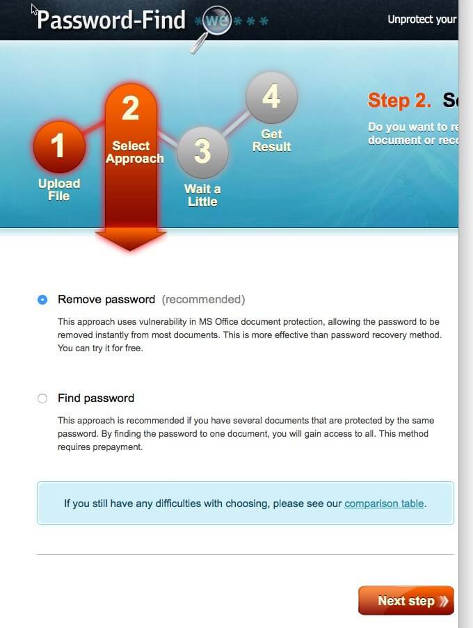 The graphics for the instructions are very clear. For example, the first step is to upload the file that you want cracked, or password removed.