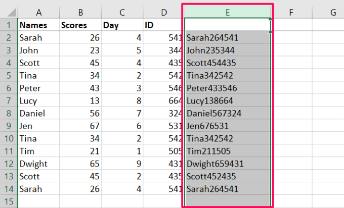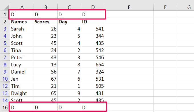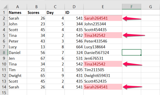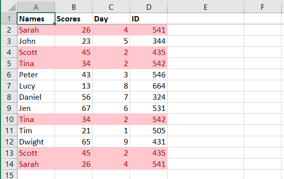 If you look closely at the image above, you’ll notice that the Conditional Formatting tool did not highlight Row 4 and Row 13. Both rows have duplicate values in the Names, Scores, and ID columns, but different values in the Day column.