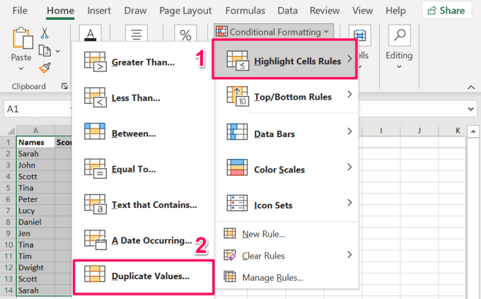 - Hover your mouse cursor on **Highlight Cell Rules** and select **Duplicate Values**.