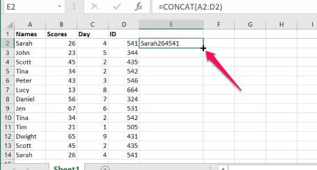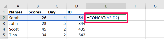 In our sample worksheet (see image below), the first and last cells on the first row have the reference A2 and D2, respectively. Hence, the formula will be this form: =CONCAT(A2:D2).
