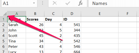 - * Press Control + A to select your list or table. Alternatively, click the Select All icon at the top-left corner of the table to select the entire worksheet.