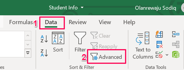 - Go to the Data tab and select Advanced in the “Sort & Filter” section.