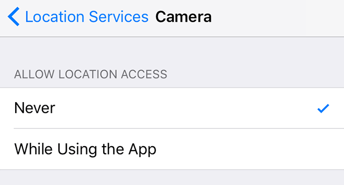 The Camera app won’t be able to use your location data and as a result your photos won’t have any geo-data embedded in them on your iPhone or iPad.