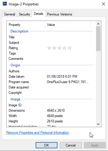 - When the properties box opens, click on the tab that says Details. You’ll see the EXIF data of your chosen photo. To get rid of this data, you’ll find a link saying Remove Properties and Personal Information at the bottom. Click on it.