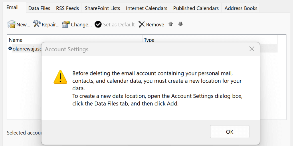 You’ll get a warning message to create an Outlook Data File (.PST) when attempting to delete the only email account in Outlook. Refer to our tutorial on exporting an Outlook PST backup file for step-by-step instructions.