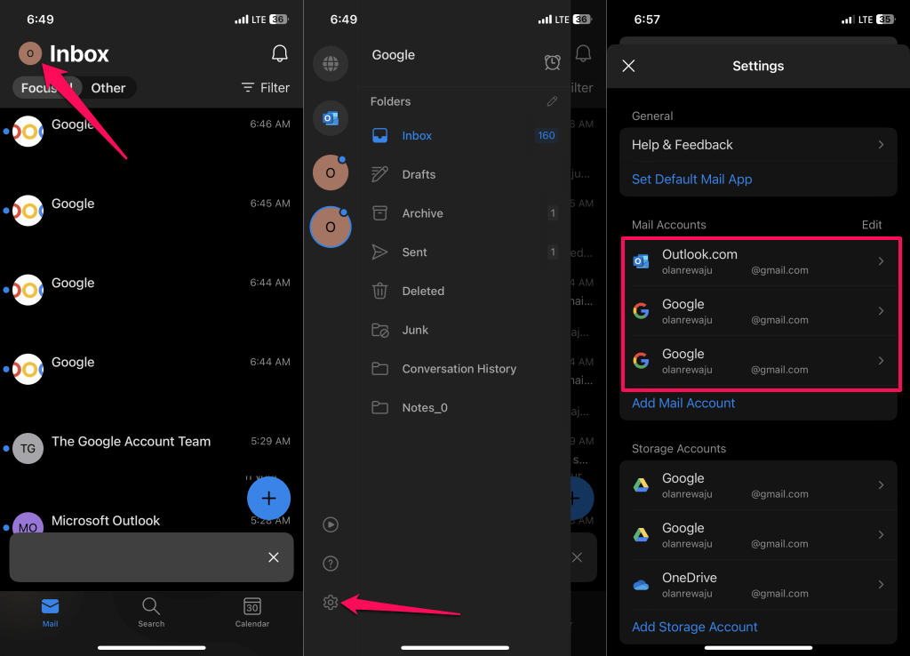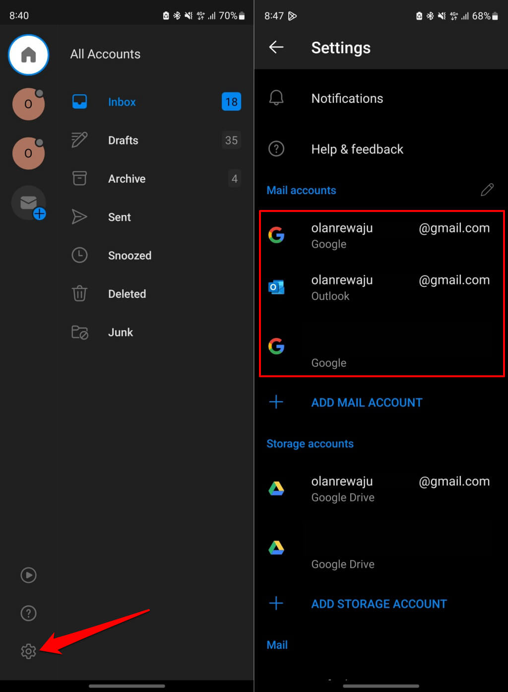 - Open Outlook, tap the profile icon/photo in the top-left corner, and select the Settings icon. Choose the account you want to remove in the “Mail accounts” section.