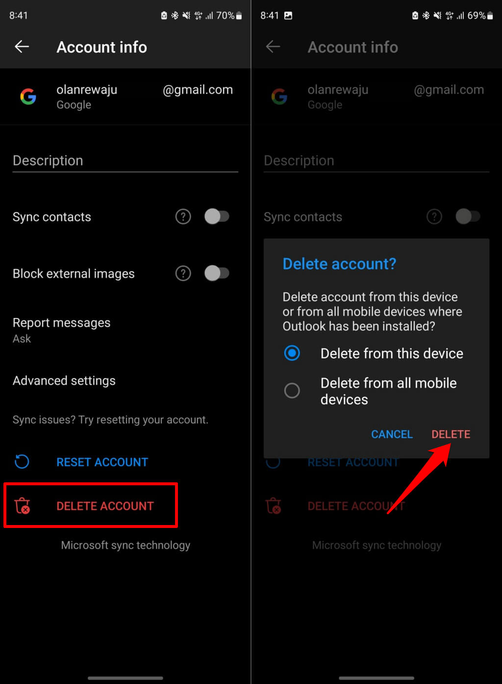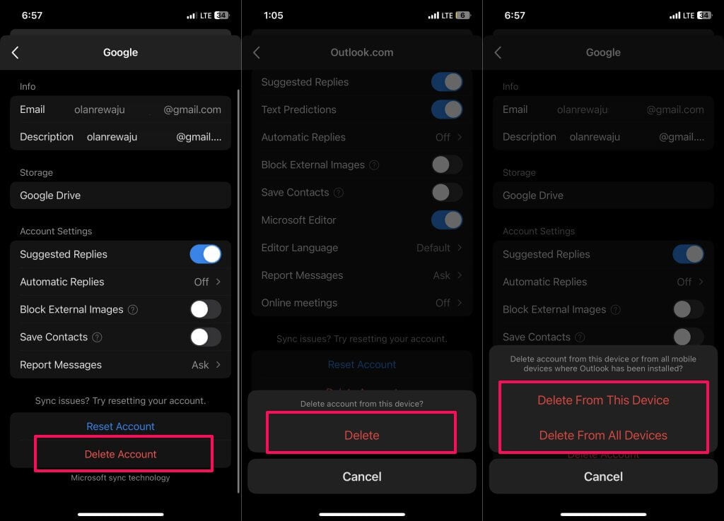 - Select Delete Account and tap Delete to remove a Microsoft Outlook account from the app. Outlook provides two account removal options for third-party emails—Delete From This Device or Delete From All Devices.