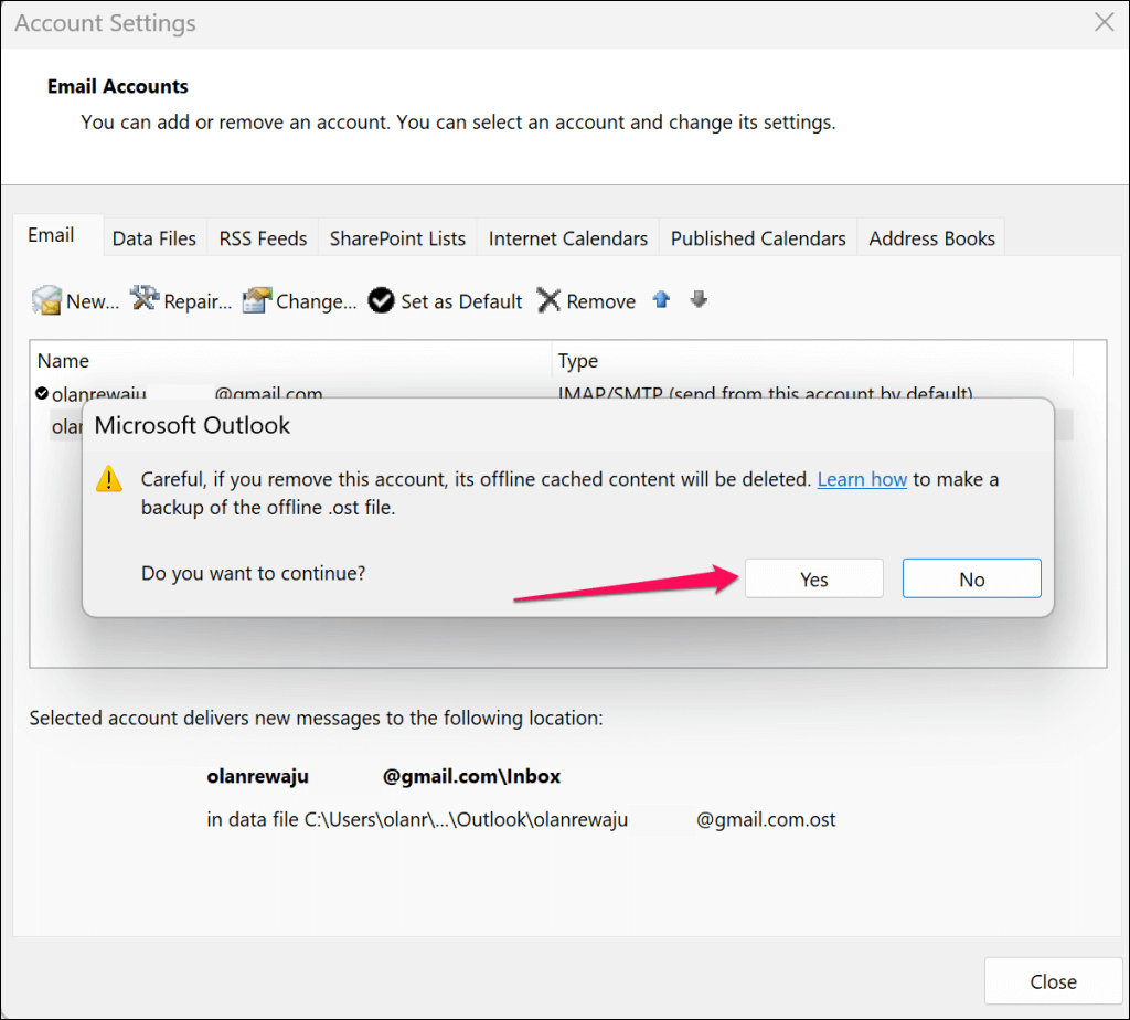 Outlook will remove the account and delete offline content stored on your computer. Messages in your inbox or outbox remain intact and accessible on other devices.