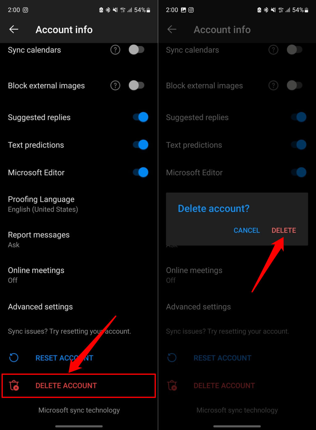 - To remove non-Outlook email addresses, tap Delete Account and choose if you want to delete the account on your phone or all devices where Outlook is installed.