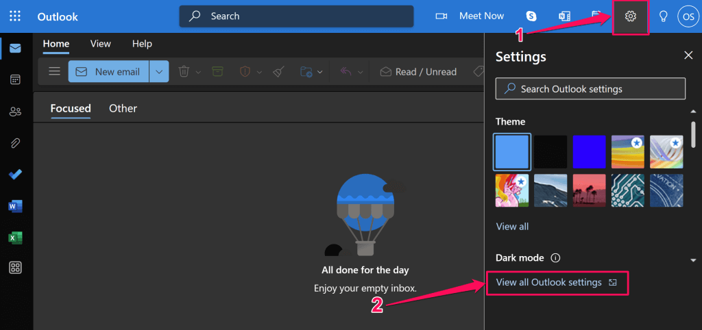 - Select the Settings icon on the toolbar and select View all Outlook settings.