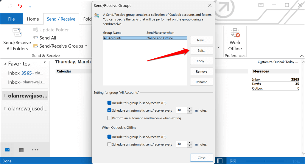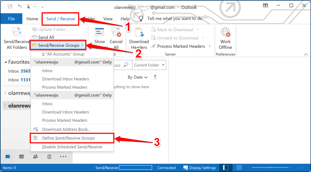 - Open the Send/Receive Groups drop-down menu and select Define Send/Receive Groups.