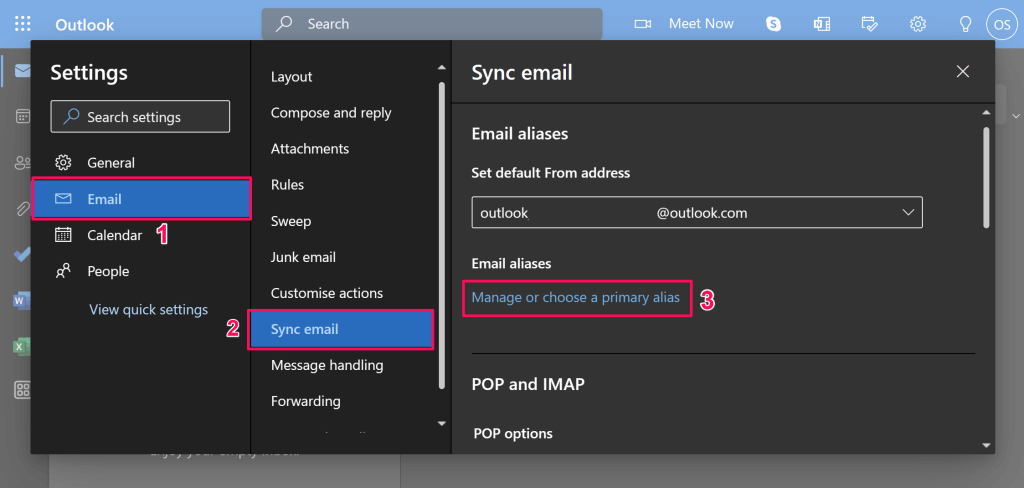 - Go to Email > Sync email and select Manage or choose a primary alias.