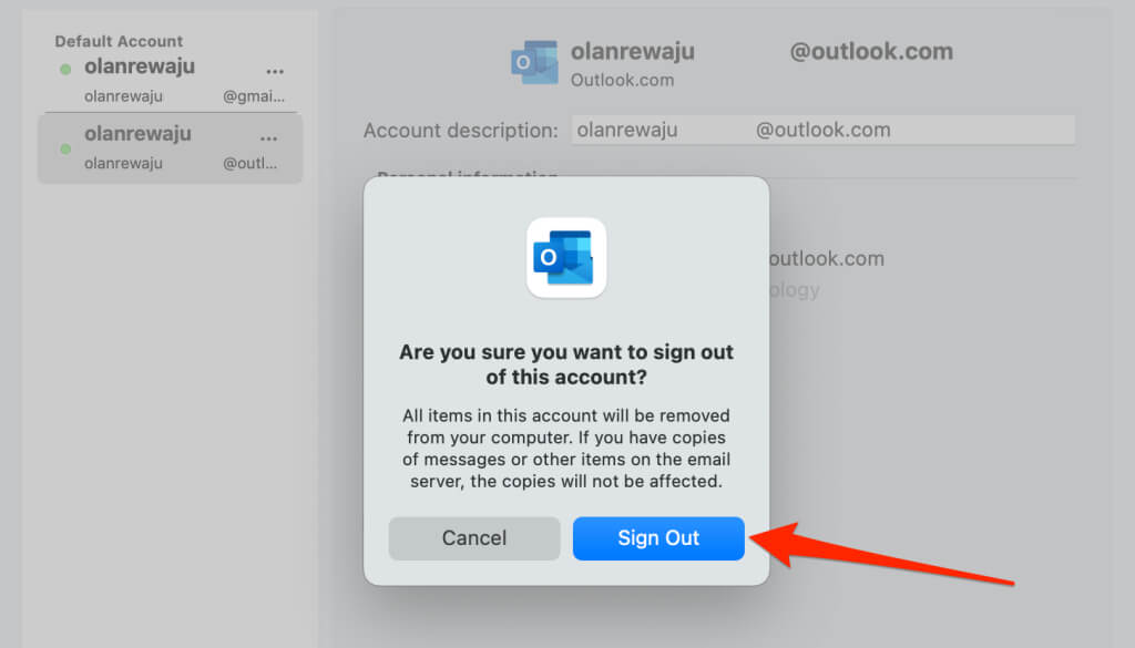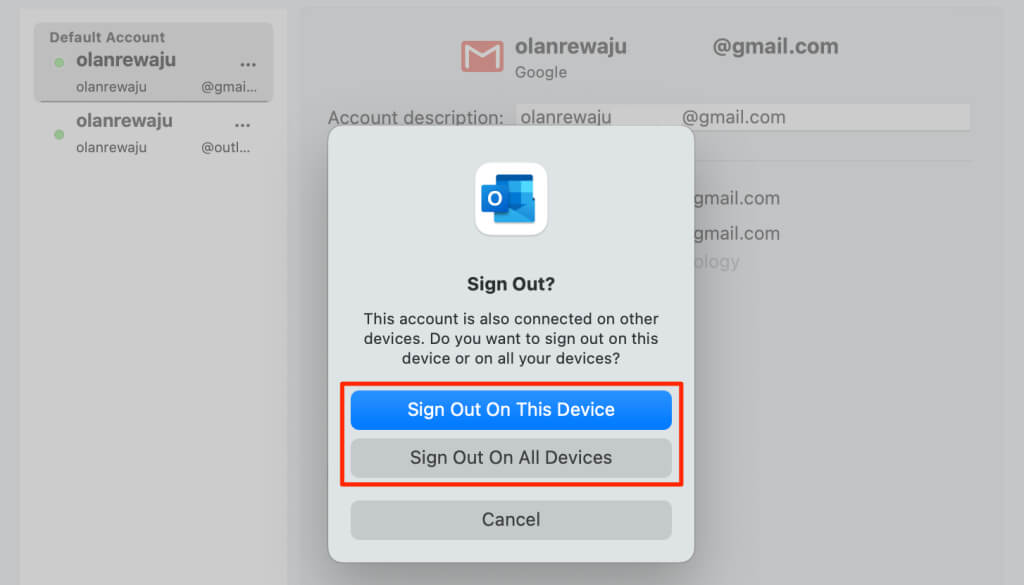 For third-party email services or accounts (Gmail, Yahoo! Mail, etc.), you can sign out on your Mac’s Outlook app or all your devices.