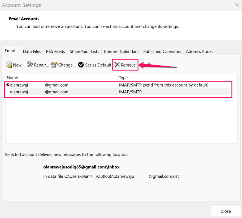 - Select Remove next to the account you want to disconnect or delete from Outlook.