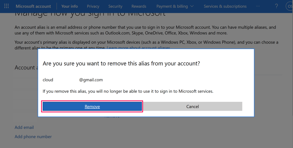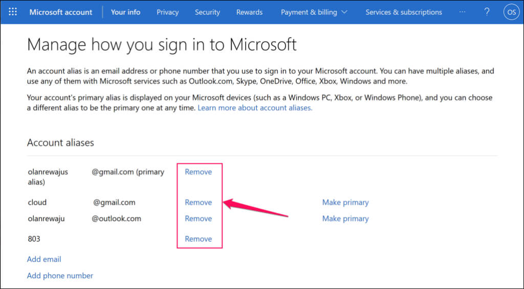 Sign in to Outlook on any web browser and follow these steps to remove an email address from your account.
