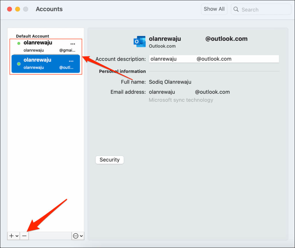- Select the email account you want to delete and select the minus icon in the bottom-left corner.