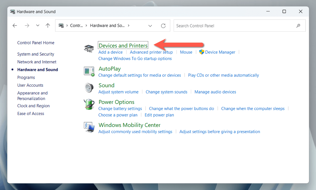 If you’re running Windows 11 version 22H2 or later, you may have trouble accessing the Devices and Printers applet using the steps above. If that happens: