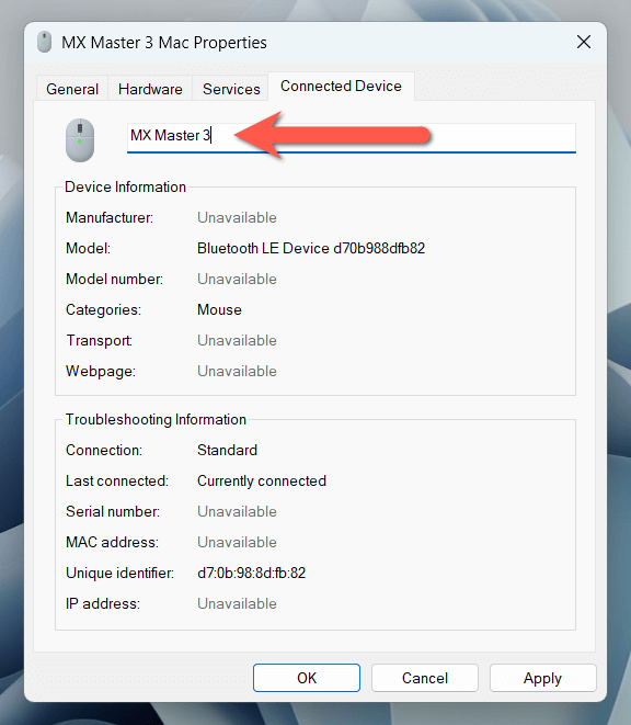 - Switch to the Connected Device tab and enter the new device name into the text field at the top of the dialog box.