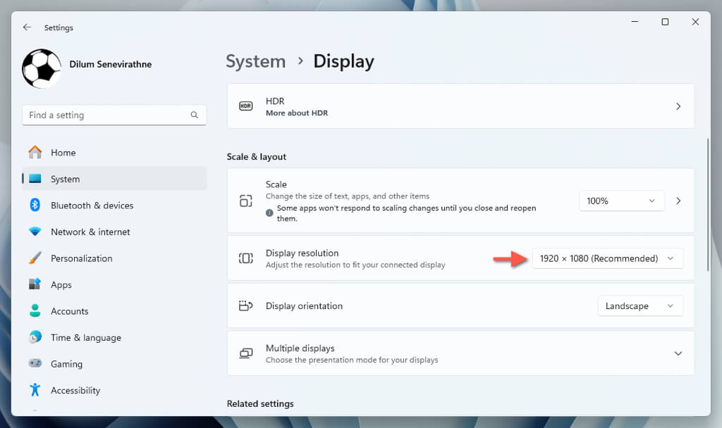 - Open the pull-down menu next to Display resolution and select the recommended resolution for your display.