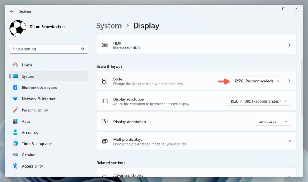 To do that, open the Settings app in Windows, go to System > Display, and choose the recommended percentage next to Scale—100% or 125%.