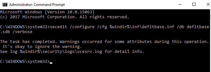 If you are running Windows 10, Windows 8, Windows 7, or Windows Vista and need to reset the security settings to their default values, use this command instead: secedit /configure /cfg %windir%\inf\defltbase.inf /db defltbase.sdb /verbose