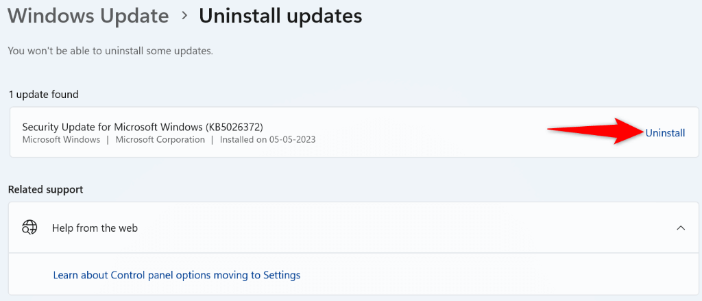 - Find the latest Windows update on the list and choose Uninstall.