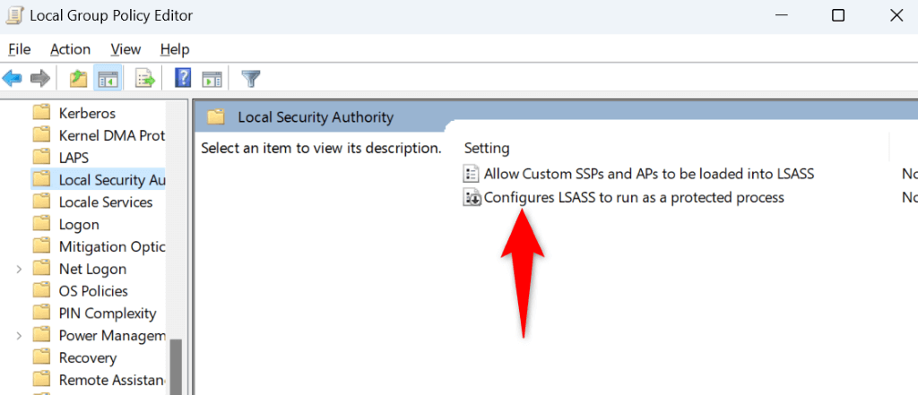 - Use the options in the left sidebar to navigate to the following path. Then, double-click the item that says Configure LSASS to run as a protected process on the right pane. Computer Configuration > Administrative Templates > System > Local Security Authority