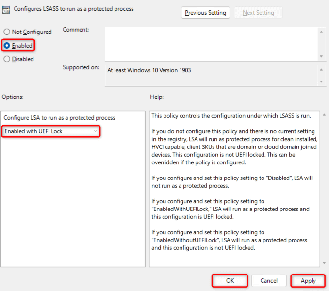 - Select Enabled on the window that opens, choose Enabled with UEFI Lock in the drop-down menu, and select Apply followed by OK.