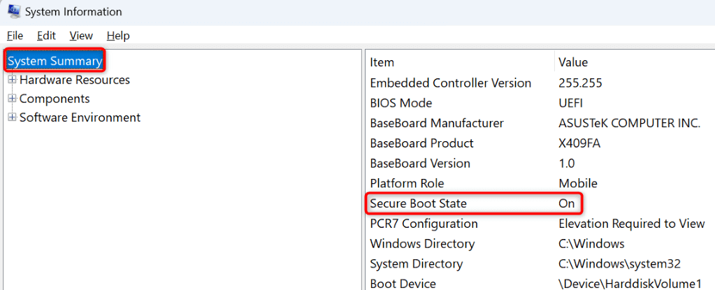If Secure Boot State’s value says Off, turn on the feature from your PC’s BIOS menu as follows:
