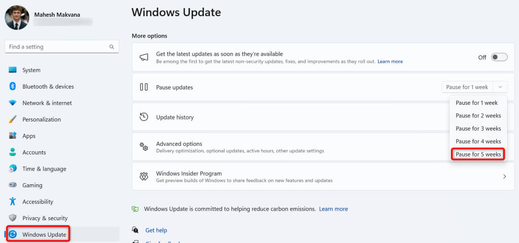 - Choose the drop-down menu next to Pause updates and select Pause for 5 weeks.