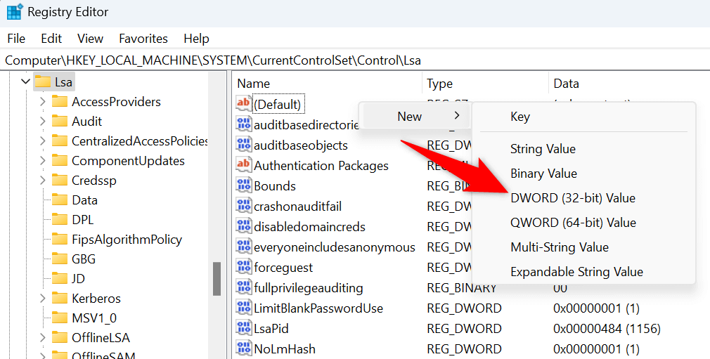 - Right-click anywhere blank on the right pane, choose New > DWORD (32-bit) Value, enter RunAsPPL as the entry name, and press Enter.
