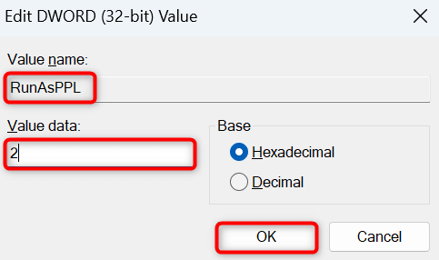 - Create another entry using RunAsPPLBoot as the entry name. * Open each entry, type 2 in the Value data field, and select OK.