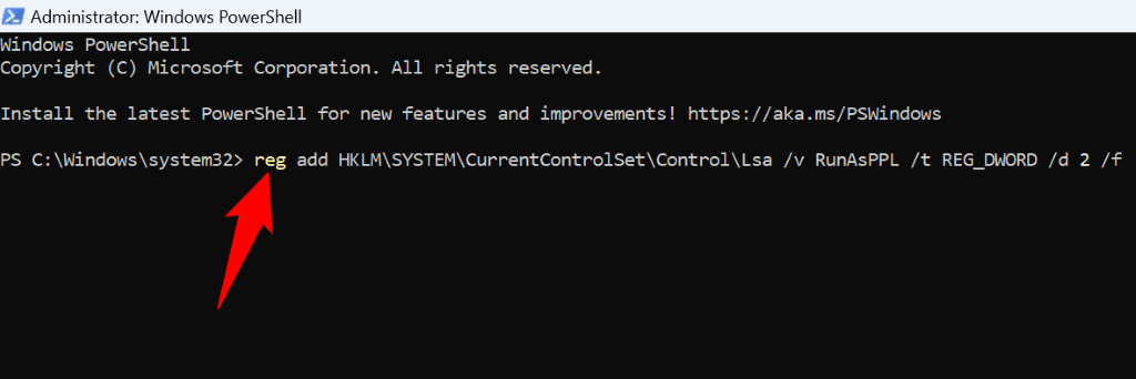 Another way to turn on LSA on your Windows PC is by using Windows PowerShell. If you don’t wish to use the Registry Editor method above, or you can’t use that method for some reason, this PowerShell method will help you out.
