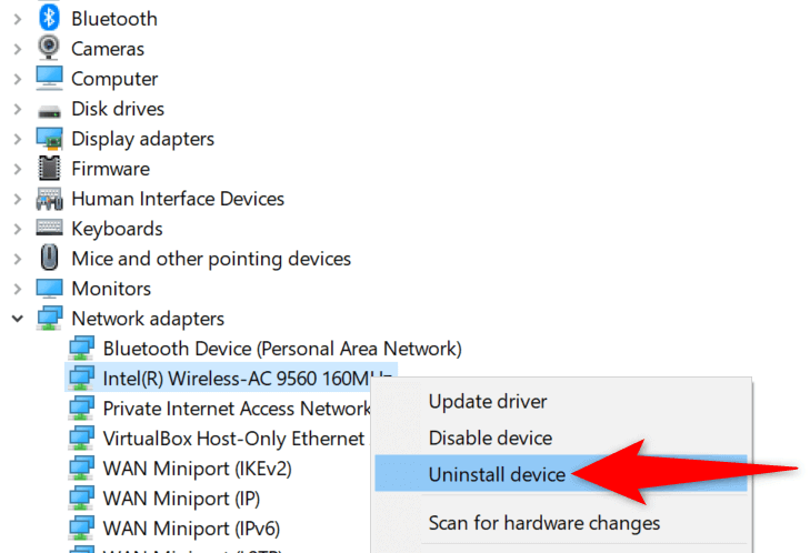 - Expand Network adapters, right-click your adapter, and choose Uninstall device.