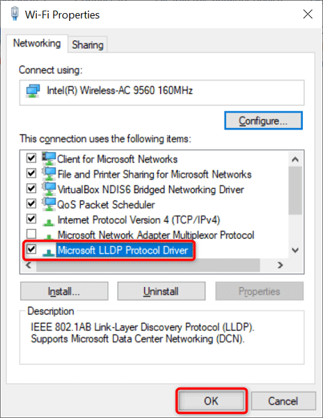 - Enable the Microsoft LLDP Protocol Driver option and select OK.