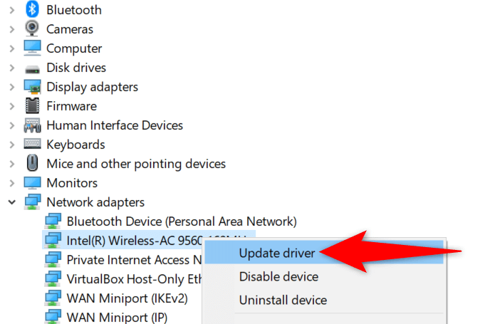 - Expand Network adapters, right-click your adapter, and choose Update driver.
