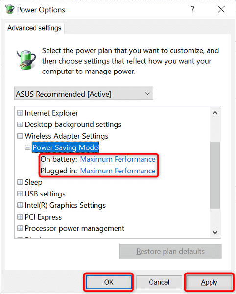- Choose Maximum Performance from both On battery and Plugged in menus.