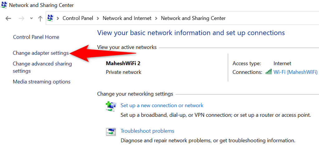 - Open Control Panel and head to Network and Internet > Network and Sharing Center > Change adapter settings.