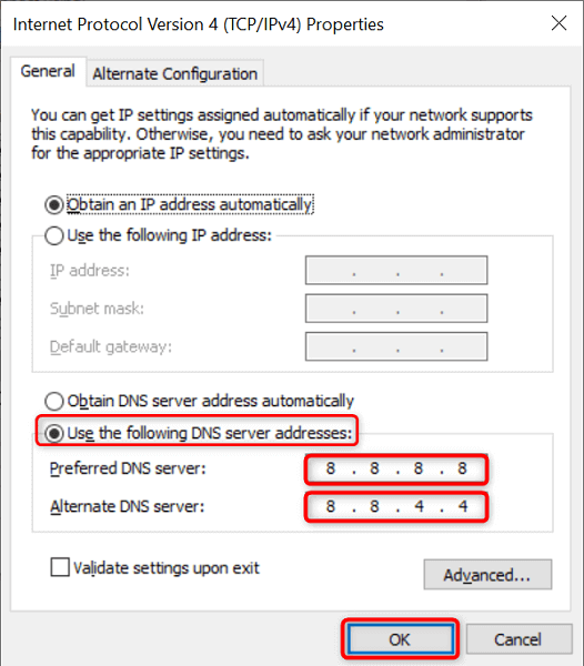 - Use Google’s public DNS servers by entering 8.8.8.8 in the Preferred DNS server field and typing 8.8.4.4 in the Alternate DNS server field.