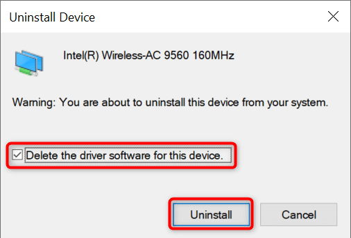 - Enable the Delete the driver software for this device option and select Uninstall.