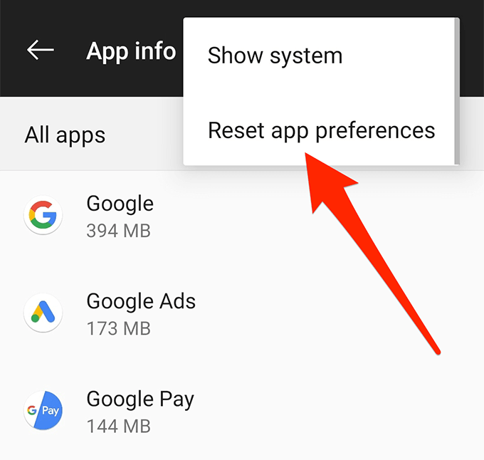 - Tap on the three-dots at the top-right corner and select Reset app preferences.