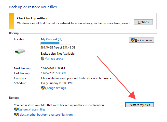 Windows 10 also allows you to recover deleted files and folders that were included within backups created using the older Backup and Restore tool from Windows 7. Unlike with File History, however, restoring your data does involve a bit of work.
