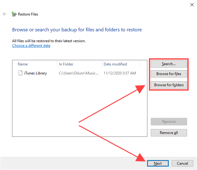 On the Restore Files window that shows up, you can use the **Search **button to find and add files and folders inside the backup that you want to recover. Or, you can select the **Browse for files **or **Browse for folders **buttons to dig into the backup and add them manually.