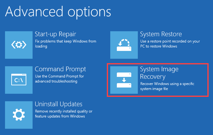 To restore a system image, go to **Start **> **Settings **> Update & Security > **Recovery **and select Restart Now to boot into the Windows Recovery Environment. Then, select **Troubleshoot **> Advanced Options > System Image Recovery and pick the system image from an external drive to initiate the recovery procedure.