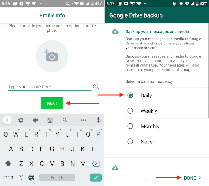 - Now, enter your WhatsApp display name and tap the **Next** button. * Once the initialization process is done, you’ll see an option for setting up Google Drive backup service on your new phone. Here, it’s best to select the **Daily** option. Then, tap the **Done** button.