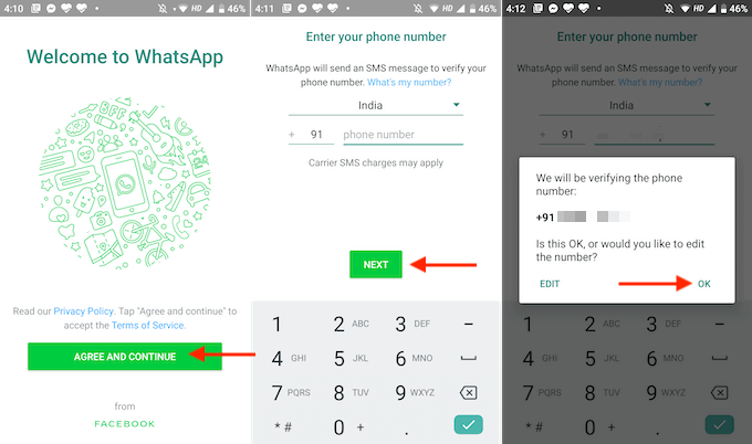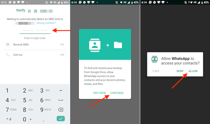 - WhatsApp will now send you a verification SMS. If the app has access to the Messages app, the process will be completed automatically. If not, you’ll have to manually enter the verification code. * Now, WhatsApp will ask permission to access the data on your device. Tap the **Continue** button. * WhatsApp will ask you permission to access your contacts. Tap the **Allow** button.