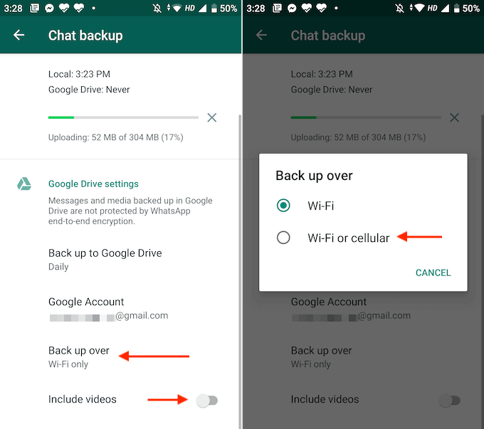 - From the Chat Backup section, scroll down to customize your backups. From the **Back Up Over** section, you can switch to the **Wi-Fi or Cellular** option. And you can enable the **Include Videos** option to back up videos as well.