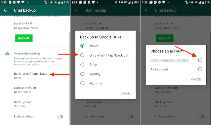 - Here, scroll down, and select the **Back Up to Google Drive** option. * The app will ask if you want to back up manually or you want to automatically backup your data on a daily, weekly, or monthly basis. If you’re doing this on the old phone and you only want to move the data once, choose the **Only When I Tap “Back Up”** option. * From the next popup, choose the Google account you want to back up to. If you don’t see your Google account here, you’ll have to go to the Settings app and sign in with your account.