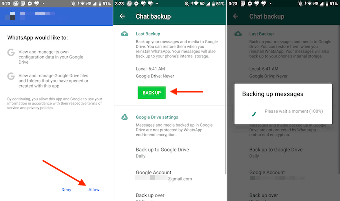 - From the next screen, tap the **Allow** button to link your WhatsApp account with Google Drive. * Now the setup process is complete. From the Chat Backup section, tap the **Backup** button to start the backup process.