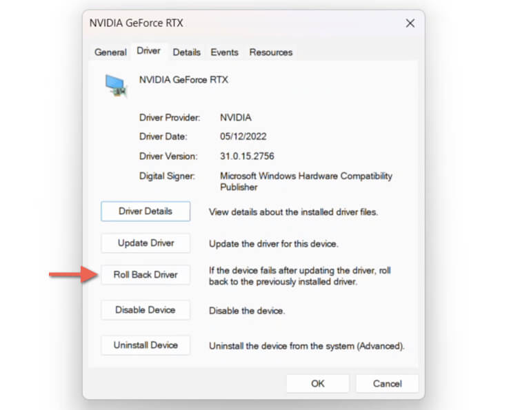 Suppose you began experiencing issues immediately after updating your NVIDIA video card drivers. In that case, you can use the Device Manager in Windows 11 to revert to the driver version you were on before. Here’s how: